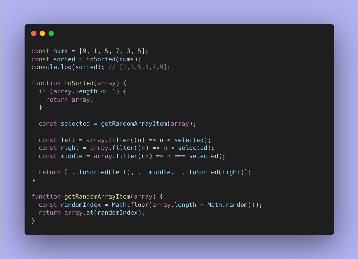 const nums=[9,1,5,7,3,5],sorted=toSorted(nums);function toSorted(t){if(t.length<=1)return t;let r=getRandomArrayItem(t),e=t.filter(t=>tt>r),n=t.filter(t=>t===r);return[...toSorted(e),...n,...toSorted(o)]}function getRandomArrayItem(t){letr=Math.floor(t.length*Math.random());return t.at(r)}console.log(sorted);